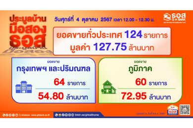 "ธอส." เผยผลการประมูลบ้านมือสองออนไลน์ ประจำเดือนต.ค.67 ขายได้ 124 รายการ มูลค่ารวมกว่า 127.75 ล้านบาท