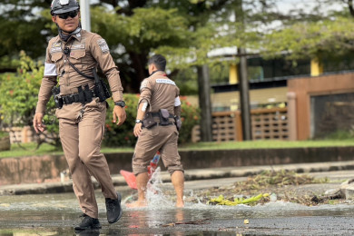 "ตำรวจสังขะ" ระดมกำลังช่วยชาวบ้านน้ำท่วม! อำนวยความสะดวกจราจร-เร่งระบายน้ำ หลังฝนตกหนักที่ "สุรินทร์"