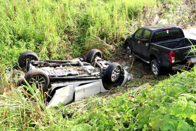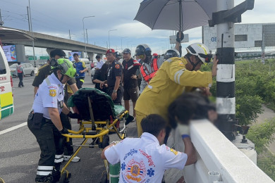 หนุ่มแมสเซ็นเจอร์จีพีเอสพาหลง ขึ้นยกระดับสุวรรณภูมิ ถูกเก๋งชนท้ายไฟลุก อาการสาหัส