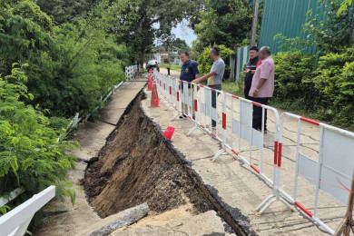 ถนนพังยับ! ฝนหนักเซาะดินทรุดลึก 3 เมตร เทศบาลชุมเห็ดเร่งฟื้นพื้นที่เสี่ยง ห้ามรถผ่านเด็ดขาด