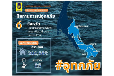ปภ.แจ้งเตือน 9 จังหวัดภาคใต้ เฝ้าระวังสถานการณ์น้ำท่วมฉับพลัน น้ำป่าไหลหลาก น้ำท่วมขัง และคลื่นลมแรง 12 - 16 ธ.ค.