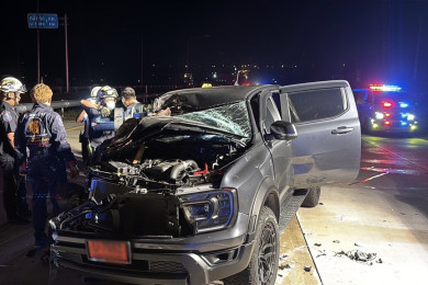 ไฟดับถนนมืด หนุ่มใหญ่ซิ่งกระบะเสยท้ายพ่วง 18 ล้อ เจ็บติดคารถ