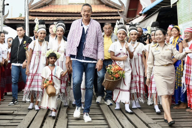 “เศรษฐา” กราบหลวงพ่ออุตตมะ สวมเสื้อชาวมอญ ปะแป้งทานาคารูปหัวใจ จูงมือเด็กชาวมอญ เยี่ยมชมความสวยงามสะพานมอญยามเย็น