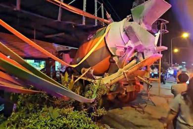 คนขับรถโม่ปูนวูบผ่าไฟแดงชนเก่งกลางแยก พุ่งเข้าร้านค้า จยย.พัง 3 คัน