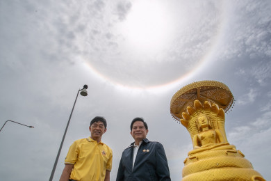 ฮือฮา!! พระอาทิตย์ทรงกลด "พีระพันธุ์" สักการะหลวงพ่อเจ็ดกษัตริย์ หลังลงพื้นที่ชมโรงไฟฟ้าพลังน้ำลำตะคองชลภาวัฒนา