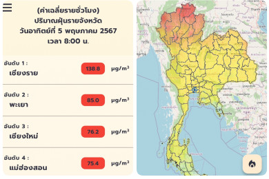 PM2.5 เช้านี้พบ 6 จังหวัด ภาคเหนือ จมฝุ่นพิษมีผลกระทบต่อสุขภาพ  ลำพูน เชียงราย เชียงใหม่เกิน 100 ไมโครกรัม