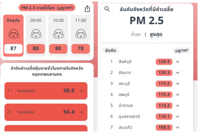 ฝุ่น PM2.5 ณ เวลา 7 โมงเช้า แดงเถือกทุกเขต ธนบุรีค่าฝุ่นสูงสุด  145.9 ไมโครกรัม