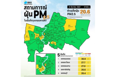 เช็กเลย! เช้านี้ กทม. PM 2.5 เกินมาตรฐาน 67 พื้นที่ มีผลกระทบต่อสุขภาพ ควรสวมหน้ากากอนามัย จำกัดเวลาทำกิจกรรมกลางแจ้ง