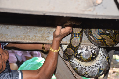 อุทัยธานี เหลือมเขมือบห่านไปไม่ไหว นอนมอบตัวให้กู้ภัยมาจับ ชาวบ้านลุ้นระทึก คอหวยส่องเลขที่บ้าน