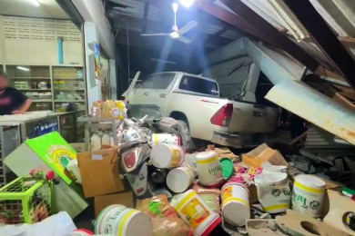 นาทีมรณะ!! กระบะซิ่งชนแหลกเก๋ง-จยย.พ่วงข้าง พุ่งทะลุเข้าร้านเคมีการเกษตรพังยับ ดับ 2 ราย