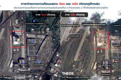 GISTDA เผยภาพถ่ายจากดาวเทียม THEOS-2 ภาพก่อนเกิดเหตุ เทียบกับภาพหลังเกิดเหตุแผ่นดินไหว บริเวณอาคารสตง.