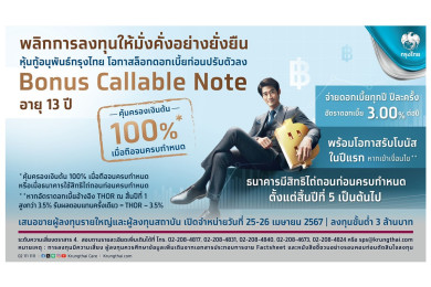 กรุงไทยพลิกโอกาสการลงทุน ล็อกดอกเบี้ยสูง 3.0% กับหุ้นกู้อนุพันธ์กรุงไทย Bonus Callable Note พร้อมโอกาสรับผลตอบแทนโบนัสปีแรก
