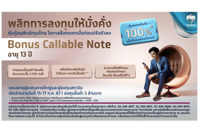 พลิกโอกาสลงทุน ล็อค ดบ.สูง 3.10% กับหุ้นกู้อนุพันธ์กรุงไทย Bonus Callable Note โอกาสรับผลตอบแทนโบนัสปีแรก จองซื้อ 15-17 ก.ค.นี้