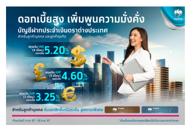 “กรุงไทย” ออกเงินฝากประจำสกุลต่างประเทศ ครอบคลุมดอลลาร์-ปอนด์-ยูโร ดอกเบี้ยสูงสุด 5.20% ต่อปี