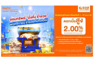 ธอส.ชวนเปิดบัญชีเงินฝากออมทรัพย์ “มั่งคั่ง ร่ำรวย” ตั้งแต่วันที่ 1-27 พ.ย.67 รับดอกเบี้ยสูงถึง 2.00% ต่อปี
