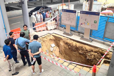 เกิดเหตุพื้นดินทรุด ข้างทางขึ้นสถานีรถไฟฟ้า สามแยกไฟฉาย