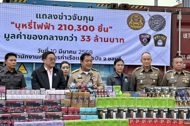 "ทวี" แถลงข่าว "DSI-ศุลกากร-สตช." ยึดบุหรี่ไฟฟ้าลักลอบนำเข้าจากจีน 200,000 ชิ้น กว่า 33 ล้าน