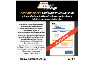ตลท.ขอให้ผู้ลงทุน-ประชาชนทั่วไป อย่าหลงเชื่อมิจฉาชีพที่แอบอ้างชื่อตลาดหลักทรัพย์ฯ ไปใช้ในการหลอกลวงให้โอนเงิน