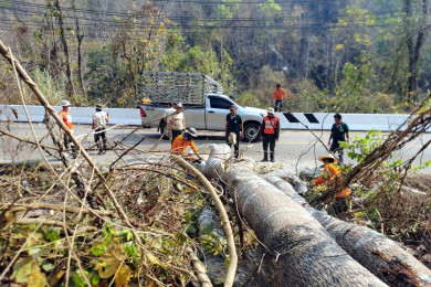 พังงา ลมกระโชกแรงส่งผลให้ต้นไม้ขนาดใหญ่หักโค่นล้มทับเสาไฟฟ้ากว่าสิบต้นขวางการจราจรถนนสาย อ.ตะกั่วป่า-ท้ายเหมือง