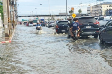 ปทุมธานีพหลโยธินสาหัส น้ำท่วมถนนหลายจุดแม่ค้าต้องลุยน้ำขายของ
