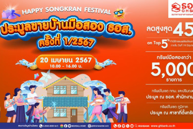 ธอส.!ประมูลขายบ้านมือสอง ครั้งที่ 1/2567 ทรัพย์เด่น ทำเลดี กว่า 5,000 รายการ ลดสูงสุดถึง 45% On top อีก 5% เสาร์ที่ 20 เม.ย.นี้