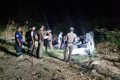 นนทบุรี หนุ่มขับกระบะชนเสาไฟฟ้า รถพลิกคว่ำล้อชี้ฟ้า เสียชีวิต1สาหัส1