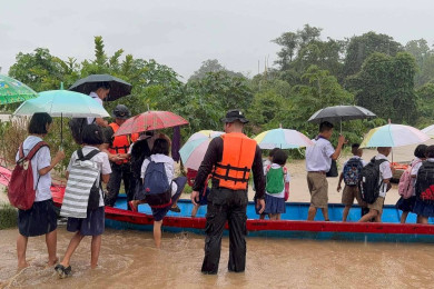หลังเลิกเรียนน้ำท่วมหนัก ฉก.ทพ.35 และ อบต. ต้อง นำเรือมาช่วย นักเรียน ผู้ปกครอง ชาวบ้าน เดินทางกลับบ้าน