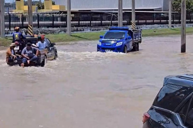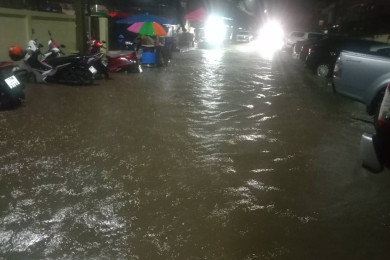 ฝนถล่มหนัก ท่วมถนนหลายสายในเขตเมืองบุรีรัมย์ กระทบแม่ค้า ถนนคนเดินเซราะกราว หดหาย