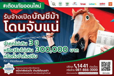 ย้ำเปิดบัญชีม้า จำคุกสูงสุด 3 ปี จับมือเครือซีพีสร้างการรับรู้ "ผนึกกำลังร่วมใจ ต้านภัยไซเบอร์ ไม่เชื่อ ไม่รีบ ไม่โอน รู้ทันกลโกง"