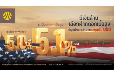"กรุงศรี" ส่งบัญชีเงินฝากประจำ สกุลเงิน USD ระยะสั้น รับดอกเบี้ยสูงสุด 5.1% ต่อปี