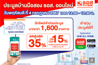 ธอส.เตรียมทรัพย์เด่นกว่า 1,300 รายการทั่วประเทศ ประมูลบ้านมือสองออนไลน์ ลดราคาสูงสุดถึง 50% 4 ต.ค.67 ผ่าน Application:GHB ALL HOME