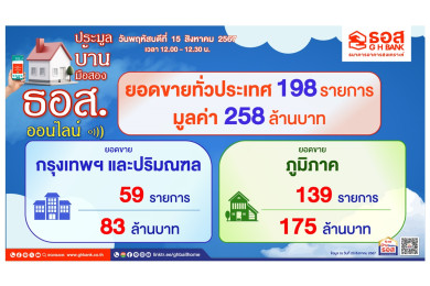 "ธอส." ประมูลบ้านมือสองออนไลน์เดือนส.ค.67 ขายได้ 198 รายการ มูลค่ากว่า 258 ล้านบาท