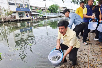 นอภ.บ้านแพ้ว จัดกิจกรรมปล่อยกระพงขาว 2 พันตัว ช่วยล่าจับกินลูกปลาหมอคางดำ