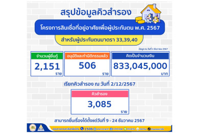 เช็คที่นี่! คิวสำรองผู้ประกันตน 3 พันกว่ารายยื่นรับสิทธิโครงการสินเชื่อที่อยู่อาศัยเพื่อผู้ประกันตน ตั้งแต่วันที่ 9-24 ธ.ค.67