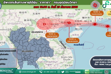 “กรมอุตุฯ” เตือนฉบับ 4 อิทธิพลพายุ “รากาซา” ทำไทยฝนตกหนัก 23–26 ก.ย. ขอปชช.ระวังน้ำท่วม-น้ำป่าไหลหลาก
