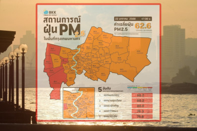 พบ 47 เขต กรุงเทพฯ ค่าฝุ่น PM2.5 ส่งผลต่อระบบทางเดินหายใจในระดับสีแดง เกิน 100 ไมโครกรัมกว่า 30 เขต
