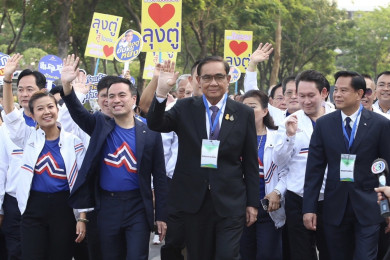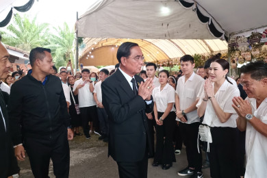 ‘ประยุทธ์’ นำทีมพรรครวมไทยสร้างชาติ เคารพศพบิดาหัวหน้าพรรคประชาธิปัตย์ ชาวบ้านเรียก ‘โกตู่’ รุมขอถ่ายรูป