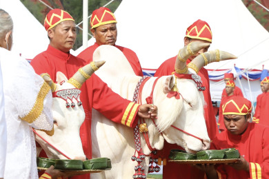 พระโคเสี่ยงทายวันพืชมงคล กินหญ้า-เหล้า