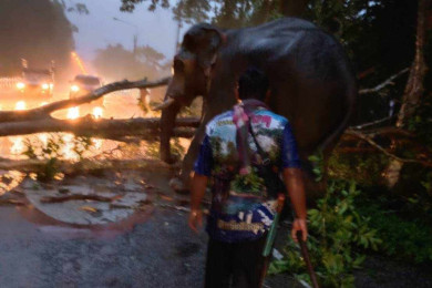 พังงา ชื่นชมช้างพรายน้ำเพชร ฝ่าสายฝนช่วยดันต้นไม้ขนาดใหญ่ จำนวน 2 ต้น ถูกพายุพัดลมขว้างถนน