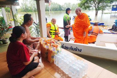 เจ้าคณะจังหวัดพิจิตรล่องเรือนำถุงยังชีพแจกจ่ายช่วยชาวบ้านที่ถูกน้ำท่วมพื้นที่ลุ่มน้ำยม