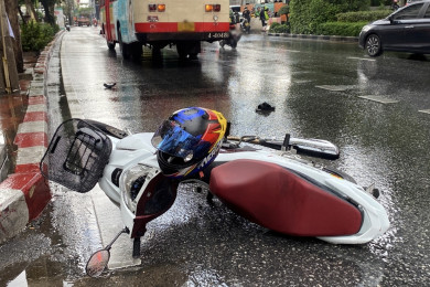 ฝนตกถนนลื่น!! หนุ่มใหญ่ขี่ จยย.เสียหลักล้มถูกรถเมล์ทับศีรษะดับคาที่