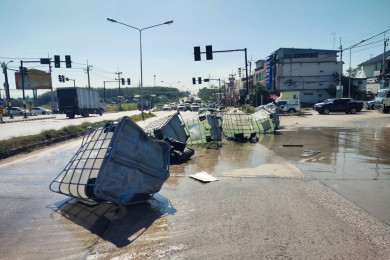 เกิดเหตุรถบรรทุกถังสารเคมีโซดาไฟเหลว 6 ถัง ขนาดถัง 1,000 ลิตร หล่นแตกไหลนองพื้นกลางสี่แยกไฟแดงมาบเตย