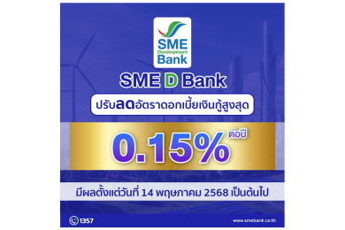 SME D Bank ลดดอกเบี้ยเงินกู้สูงสุด 0.15% ต่อปี มีผล 14 พ.ค.68 คู่เติมทุนสินเชื่อ ดบ.ต่ำคงที่ ช่วยเอสเอ็มอีลดภาระธุรกิจ