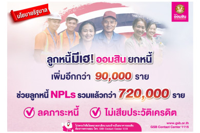 "ออมสิน" ยกหนี้เพิ่มอีก 9 หมื่นราย ช่วยลูกหนี้ NPLs สินเชื่อโควิด-19 ตามนโยบายรัฐ เพียง 3 เดือนมีผู้ได้ปลดหนี้แล้วกว่า 7.2 แสนราย