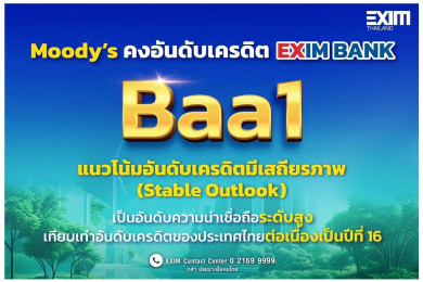 "EXIM BANK" ได้รับการคงอันดับเครดิตสากลที่ Baa1 (Stable Outlook) จาก Moody’s เทียบเท่าอันดับเครดิตของประเทศไทย ต่อเนื่องปีที่ 16