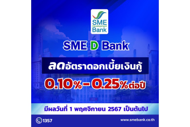 "SME D Bank" หั่นดอกเบี้ยเงินกู้ลงสูงสุด 0.25%-ตรึงดอกเบี้ยเงินฝาก มีผล 1 พ.ย.67 ควบคู่เสิร์ฟสินเชื่อดอกเบี้ยต่ำ