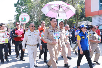อ่างทอง Kick off รณรงค์ป้องกันและแก้ไขปัญหา PM 2.5 เดินเคาะประตูบ้านสร้างความเข้าใจประชาชน