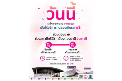ปลายเดือนมิ.ย.นี้นั่งฟรี 1 เดือน รถไฟสายสีชมพูส่วนต่อขยาย ช่วงสถานีศรีรัช-เมืองทองธานี ก่อนเปิดเต็มรูปแบบ 19 ก.ค.68