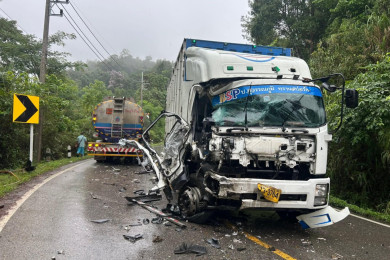 สุรินทร์ วินาศสันตะโร คนขับรถบรรทุกวูบหลับในพุ่งชนท้ายพ่วง 4 คัน อัดก๊อปปี้ติดภายใน