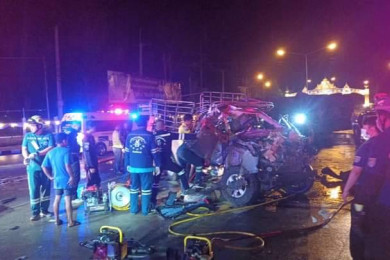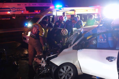 หวิดตายหมู่! เก๋ง-กระบะชนกัน 3 แยกถนนเลียบริมคลองบ้านหัวเขาแรด กาญจนบุรี บาดเจ็บ 6 ราย